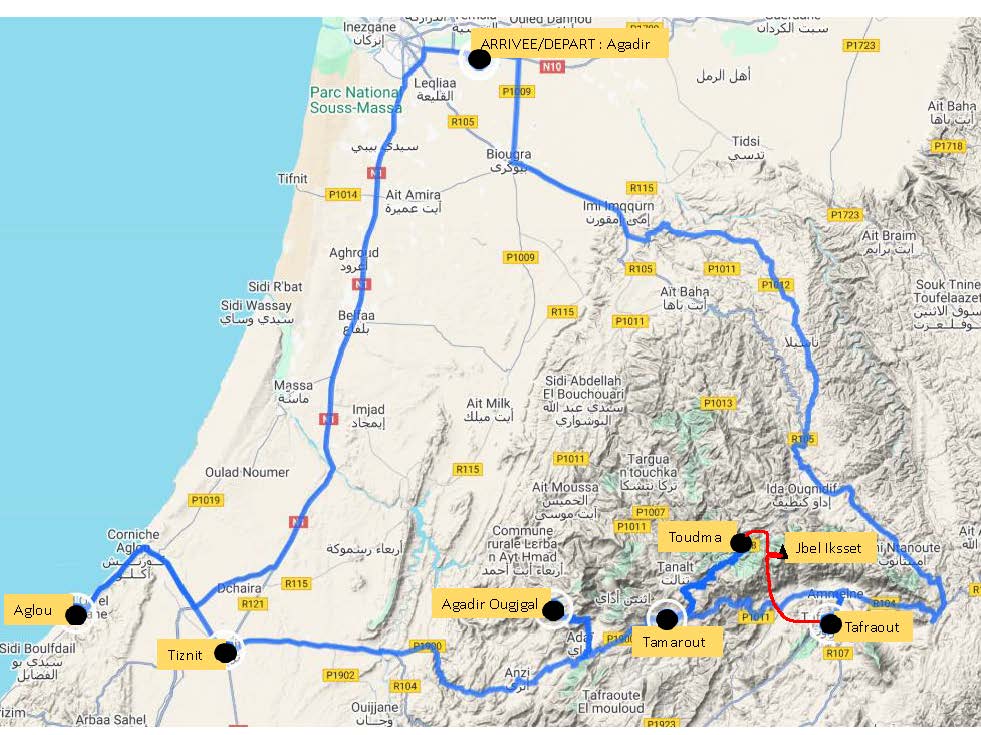 Ce voyage tout en contraste nous conduit des montagnes sauvages de l’Anti-Atlas au petit village de pêcheurs d’Aglou sur la côte Atlantique. Au départ de Tafraout, nous partons pour 3 jours de randonnée à travers la vallée d’Ammelne et ses amandiers, avant de grimper en direction du petit village berbère d’Anergui blotti au pied du jebl Iksset. Nous poursuivons vers l’Air du Dragonnier Ajgal, une zone qui fait l’objet d’un projet de classement au patrimoine naturel de l’UNESCO notamment en raison de la présence d’un arbre endémique exceptionnel : le dragonnier du Maroc (Dracaena draco subsp. ajgal).